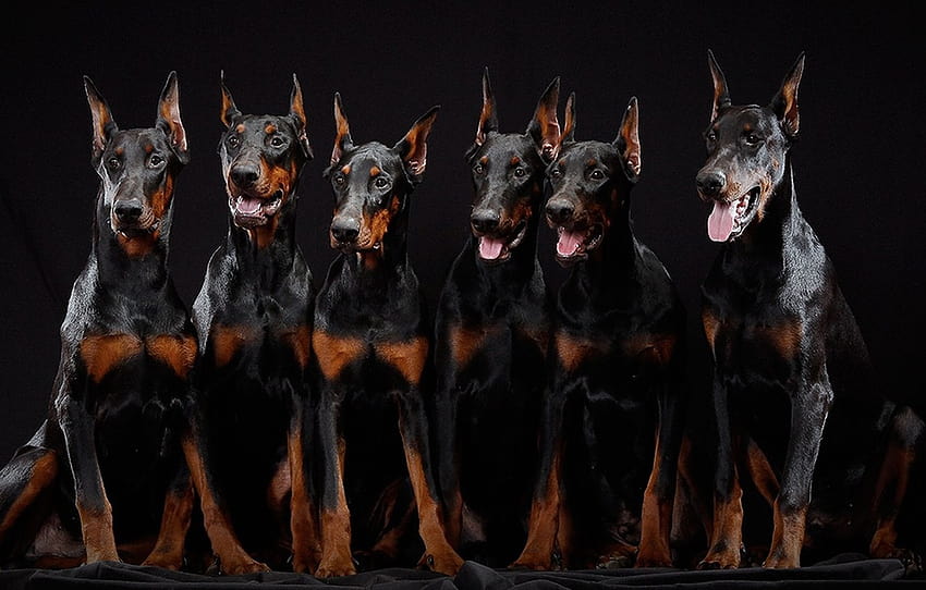 The Doberman Pinscher is a medium sized, squarely built dog with a compact, muscular body. The head is long and when viewed from the side, looks like a blunt wedge. The top of the skull is flat, and turns into the muzzle with a slight stop. The color of the nose depends on the color of the dog’s coat; black on black dogs, dark brown on red dogs, dark gray on blue dogs, dark tan on fawn dogs and pink on white dogs. The teeth meet in a scissors bite. The color of the almond-shaped eyes is various shades of brown, depending on the coat color of the dog. In the USA ears are usually cropped to stand erect (cut at the age of about 12 weeks). The pup’s ears have to be taped for a couple of months to make them stand up. A lot of breeders are starting to leave the pup’s ears natural. If left natural they develop ears somewhat like a hound. The tail is usually docked at the age of 3 days. If the tail is not docked it grows a tail somewhat like a hound. Note: cropping ears and docking tails is illegal in a lot of countries and we are starting to see more and more dogs with their body parts left in tact. The chest is broad and the legs are perfectly straight. Dewclaws are sometimes removed. The short, hard, thick coat lies flat. Sometimes there is an invisible gray undercoat on the neck. The coat comes in black, black with tan markings, blue-gray, red, fawn and white. When markings appear they are above each eye, on the muzzle, throat, forechest, legs, feet and on the tail. There is also a solid white color. While white markings are considered a fault in some clubs, in others they are accepted.